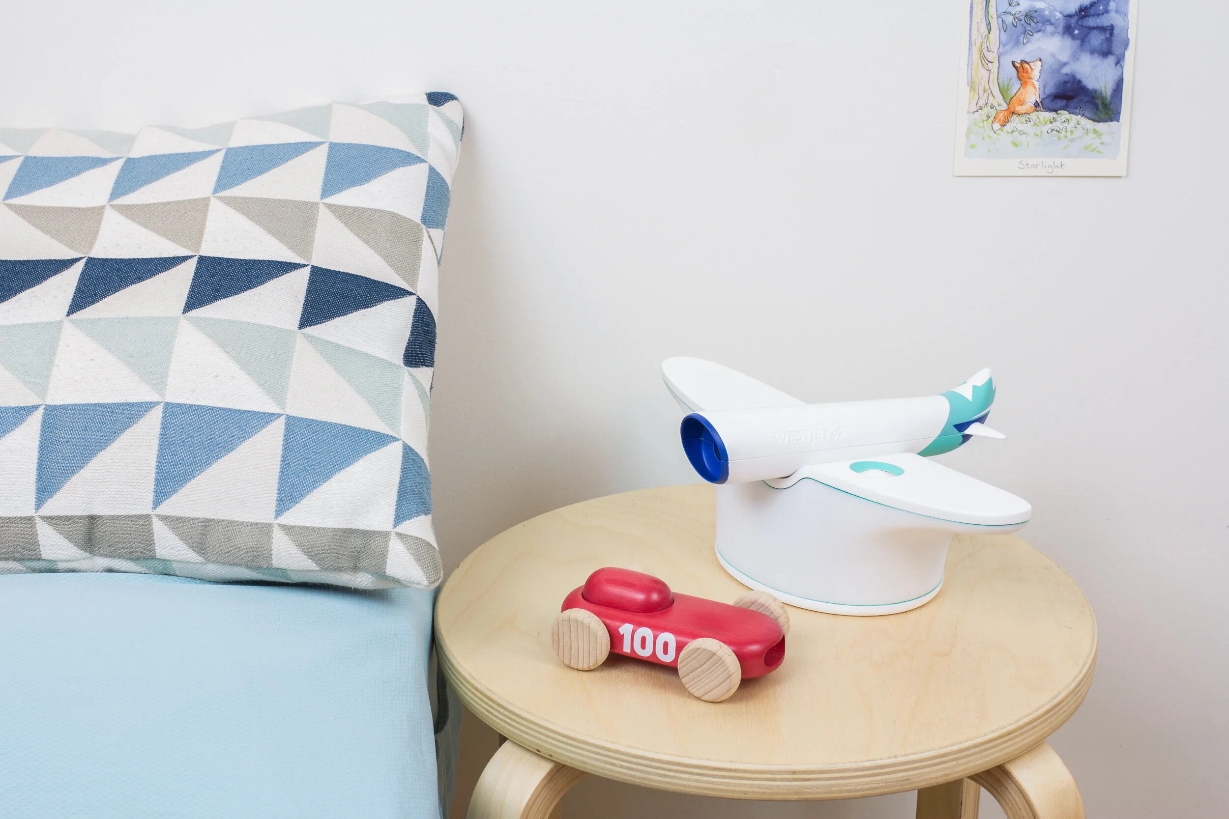 The base, designed to resemble aircraft wings, glows peacefully next to the child while they sleep, projecting a starry sky onto the child’s bedroom ceiling. A removable torch, designed to look like the fuselage of the plane, enables active play by projecting the outline of a plane onto a series of playful scenarios. Through a mobile app, parents can send messages directly to the light, to be projected onto their child’s ceiling at the push of a button. Technology that works like magic.